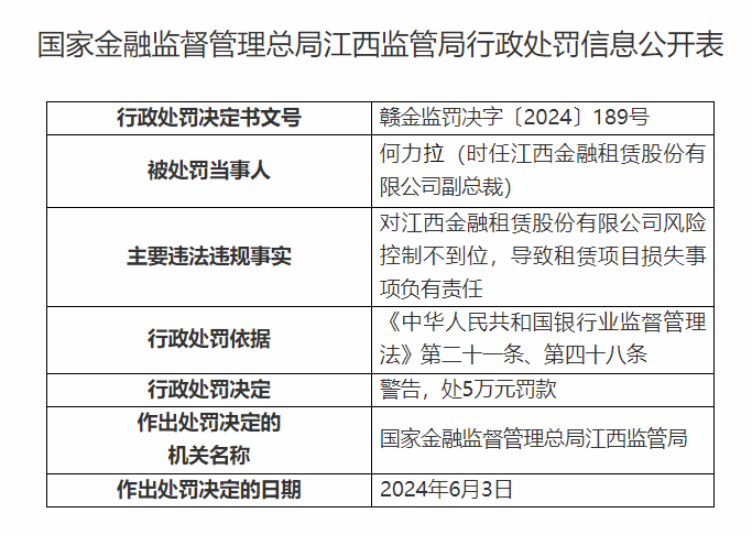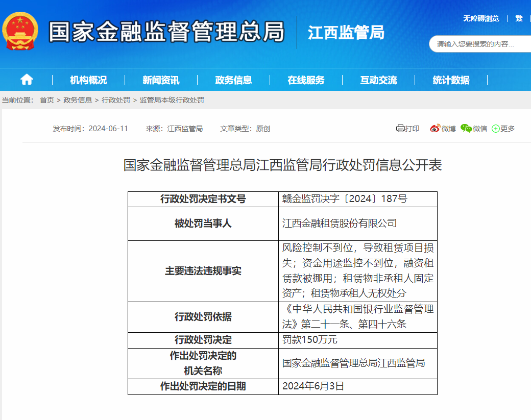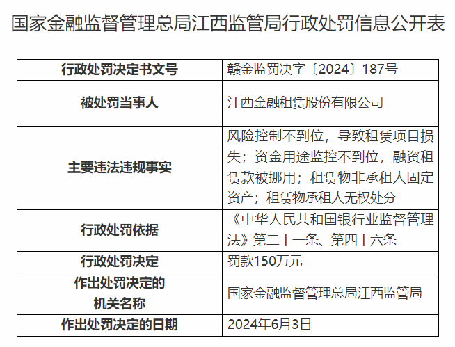 江西金融租赁股份有限公司(简称江西金租),由于多项违法违规行为,被国家金融监督管理总局江西监管局处以150万元的???。这些违规行为包括风险控制不到位导致租赁项目损失、资金用途监控不到位导致融资租赁款被挪用、租赁物非承租人固定资产以及租赁物承租人无权处分等。此外,时任江西金租总裁的姜涛和副总裁的何力拉也因对风险控制不到位负有责任,分别被处以警告和5万元??畹男姓Ψ?。