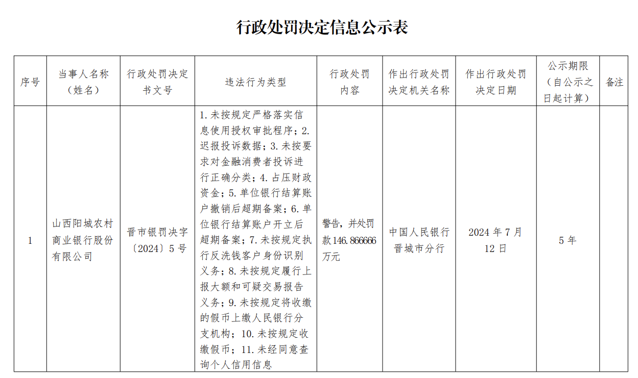具体来看,山西阳城农商行的违规行为包括,1.未按规定严格落实信息使用授权审批程序;2.迟报投诉数据;3.未按要求对金融消费者投诉进行正确分类;4.占压财政资金;5.单位银行结算账户撤销后超期备案;6.单位银行结算账户开立后超期备案;7.未按规定执行反洗钱客户身份识别义务;8.未按规定履行上报大额和可疑交易报告义务;9.未按规定将收缴的假币上缴人民银行分支机构;10.未按规定收缴假币;11.未经同意查询个人信用信息。