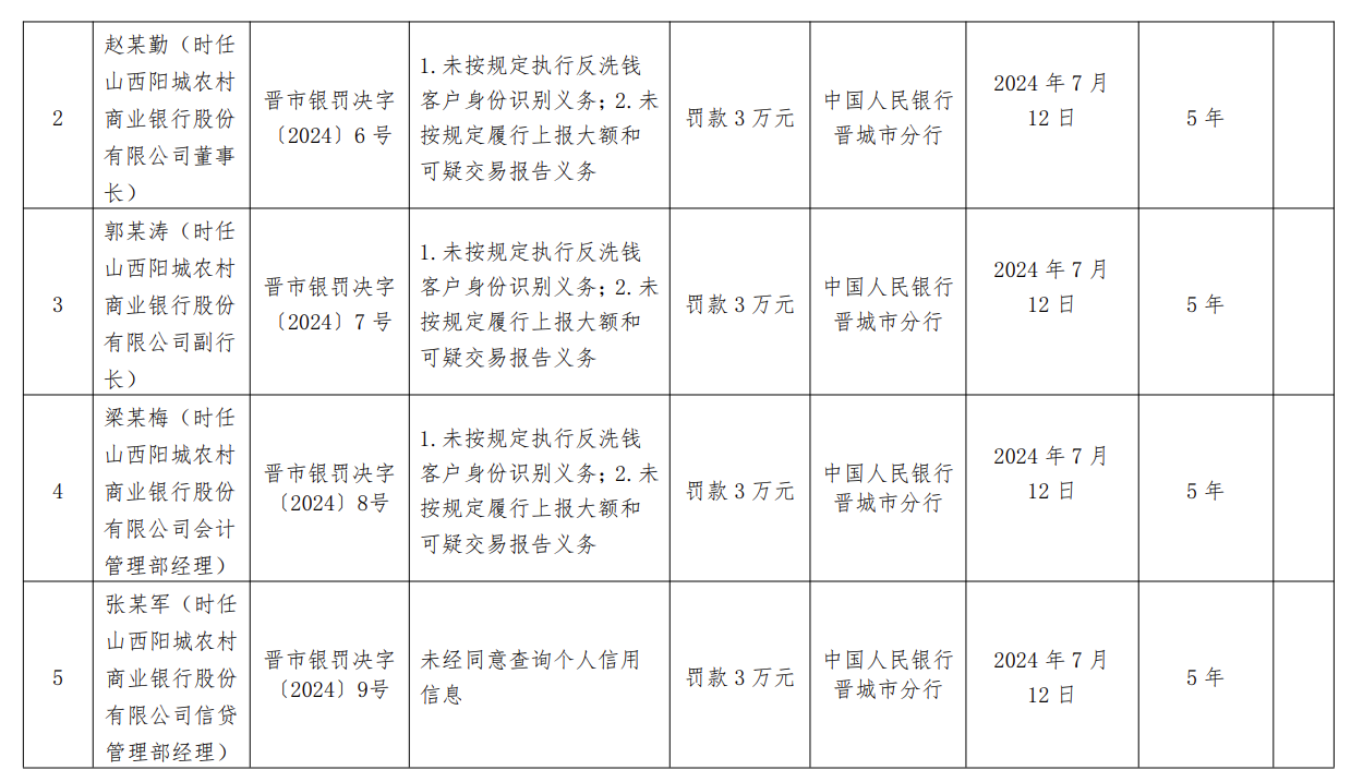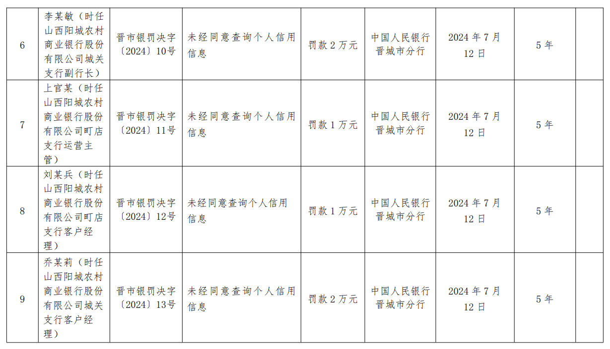 时任山西阳城农商行信贷管理部经理张某军、时任山西阳城农商行城关支行副行长李某敏、时任山西阳城农商行町店支行运营主管上官某、时任山西阳城农商行町店支行客户经理李某兵、时任山西阳城农商行城关支行客户经理乔某莉,均因未经同意查询个人信用信息,分别被罚款3万元、2万元、1万元、1万元、2万元。