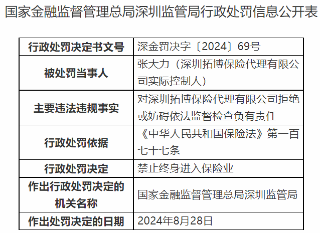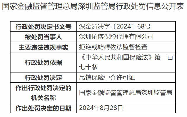 深圳拓博保险代理有限公司因拒绝或妨碍依法监督检查被吊销牌照,实控人收终身进入保险业处罚
