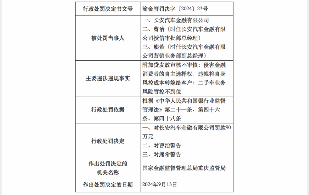 针对上述违规行为,国家金融监督管理总局重庆监管局决定对长安汽车金融处以90万元的??睿允境徒?。同时,对时任长安汽车金融授信审批部总经理曹治和营销业务部副总经理熊希分别给予警告处分,处罚决定于2024年9月13日正式生效。