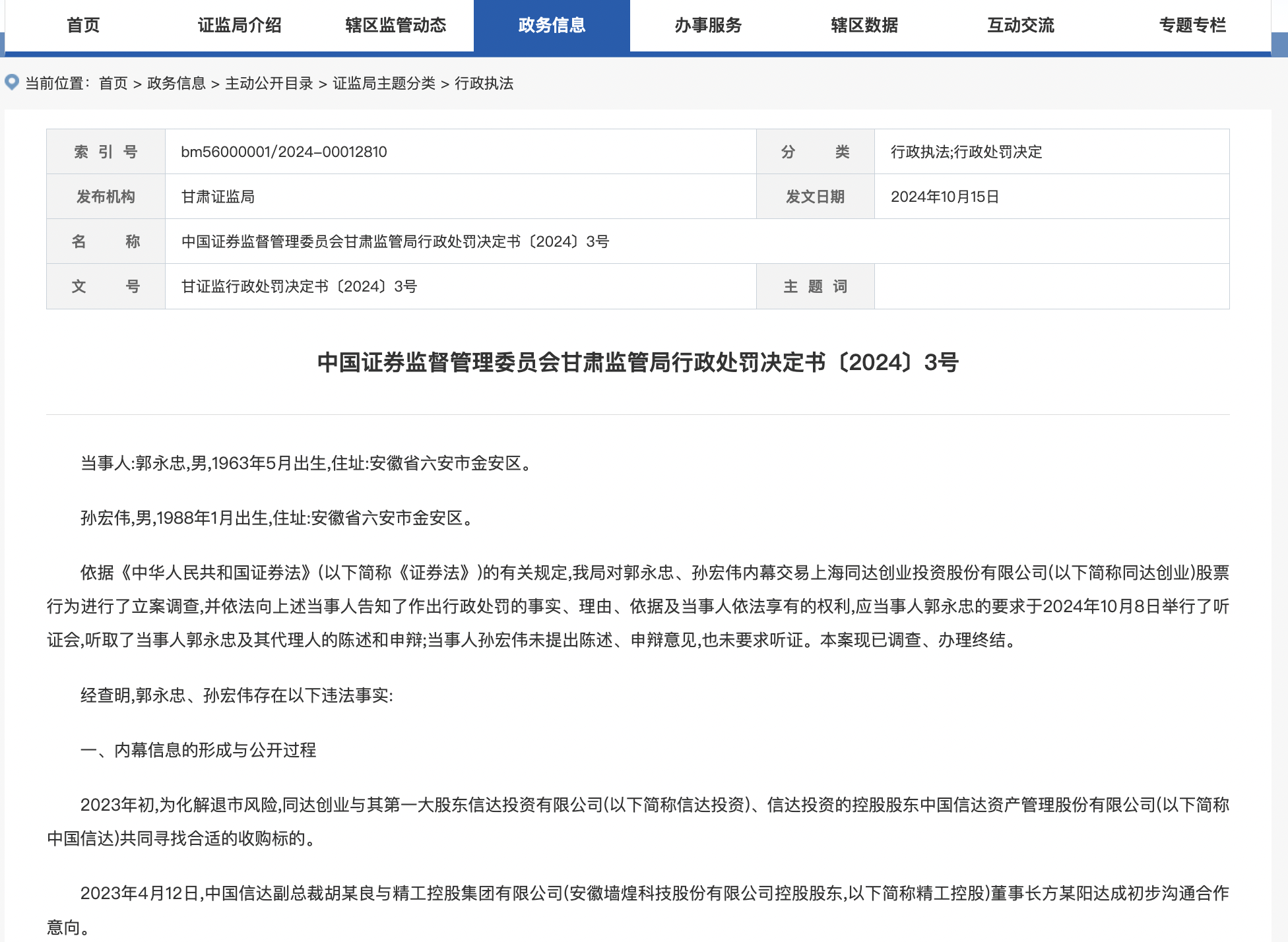 甘肃证监局指出,这一收购对价超过同达创业2022年年度经审计合并财务报表资产总额的30%,属于公司的重大投资行为,进而属于《证券法》规定的内幕信息,内幕信息敏感期为2023年4月14日至2023年9月8日开市前,郭永忠、徐华国为内幕信息知情人,郭永忠不晚于2023年6月1日知悉内幕信息,徐华国于2023年6月2日知悉内幕信息。