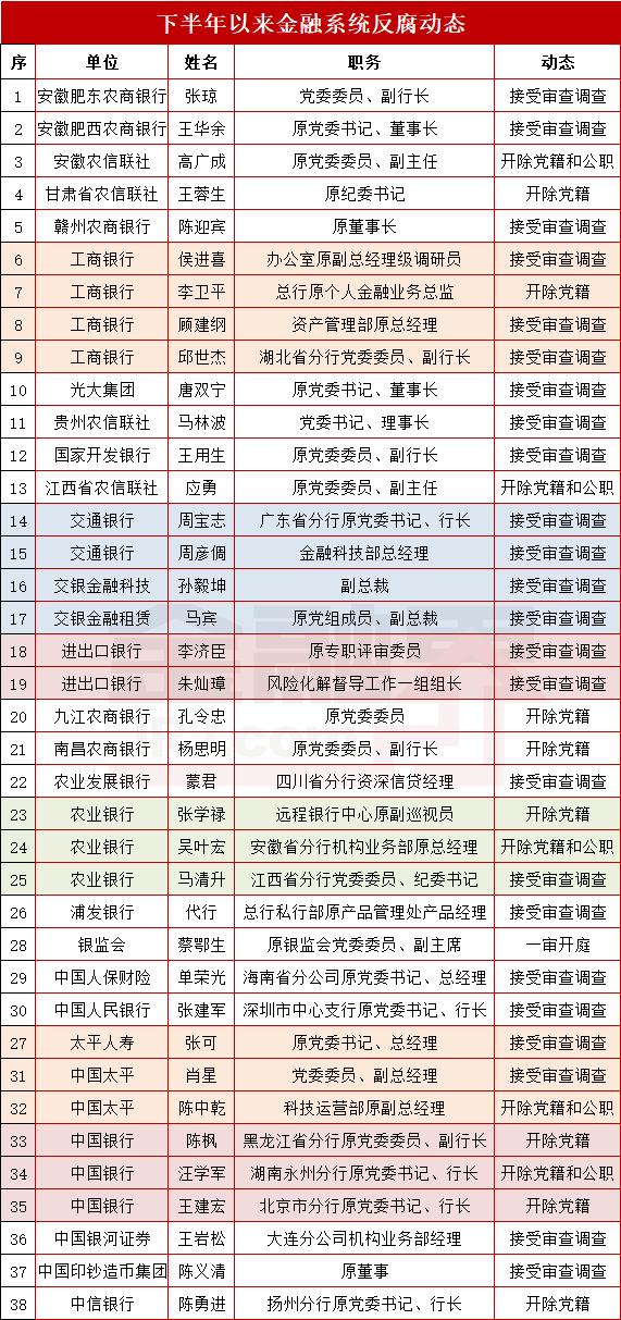 下半年以来,据不完全统计,有38名金融机构人员被纪检委通报,有官至董事长的“一把手”,也有区域负责人或信贷经理,银行业共涉及27人成重灾区。