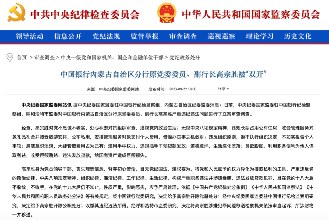 9月22日晚间,中央纪委国家监委网站通报:日前,中央纪委国家监委驻中国银行纪检监察组、呼和浩特市监委对中国银行内蒙古自治区分行原党委委员、副行长高宗胜严重违纪违法问题进行了立案审查调查。