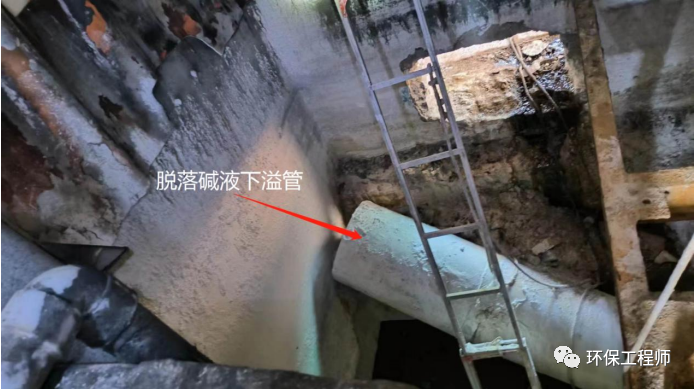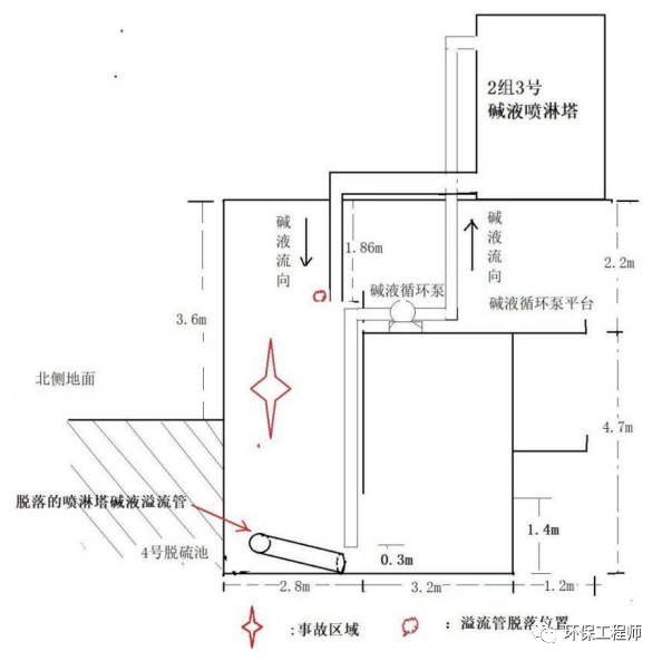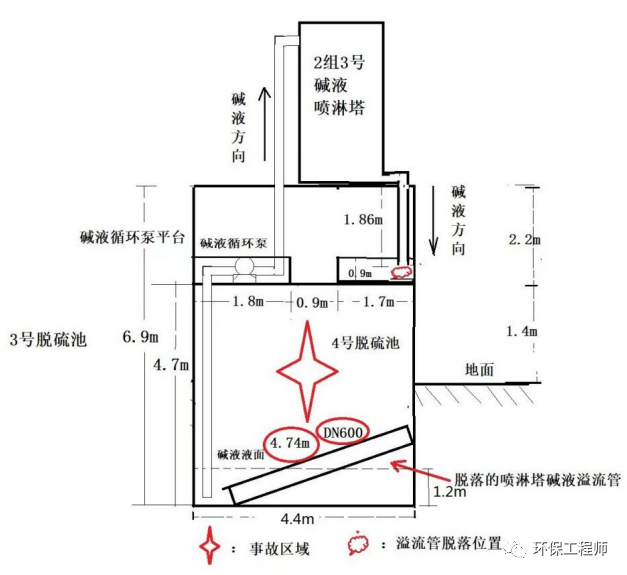 建鑫公司因脱硫车间老塔4号脱硫池中3号碱液喷淋塔碱液溢流管下部在事故发生前1个月左右脱落(脱落的碱液溢流管直径为63cm,长为4.74m,重量为129.39kg),2023年4月18日12时许,脱硫车间决定采取停炉保温检修措施,并安排脱硫车间工作人员对老塔4号脱硫池抽水以便检修。